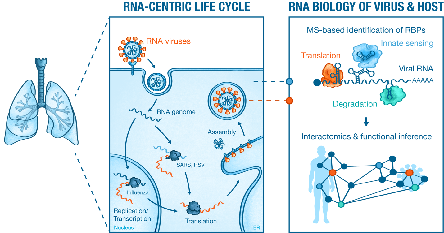 We aim to achieve a highly resolved spatial and temporal understandingof RNA regulatory events that determine the success or failure of viral infection.Particularly, we are interested in learning how viral RNA molecules interface withthe host cell, and how RNA-binding proteins shape the fate of viral RNA to controlreplication, immune evasion, and infection outcome. To dissect these processes,we apply a systems-level, RNA-centric strategy that integrates quantitative massspectrometry, functional genomics, and single-cell transcriptomics data.